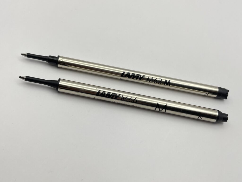 どちらもラミーのローラーボール用のリフィルですが、ざっくり分けると「M63」はキャップ式用、「M66」はノック式用です。