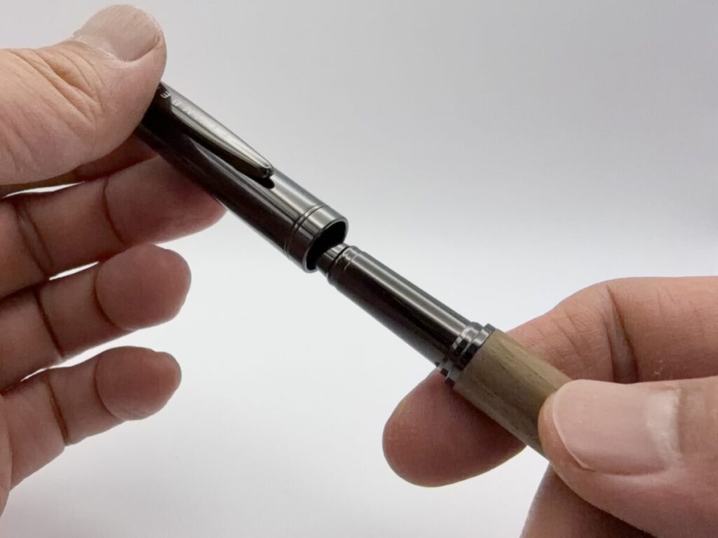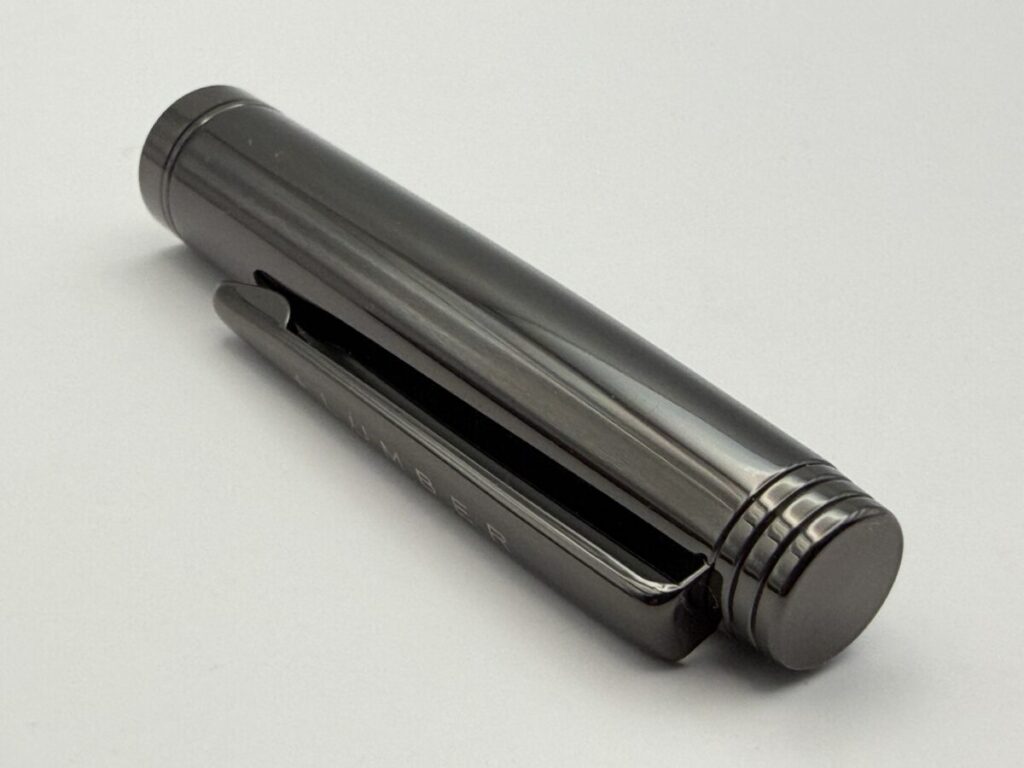 キャップや口金、尻軸に使われている金属はガンメタリックカラーで塗装されています。