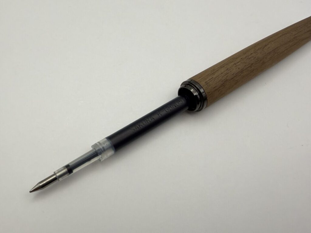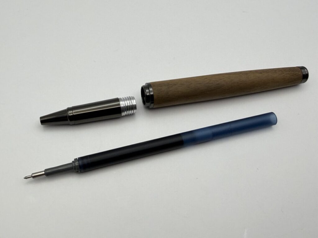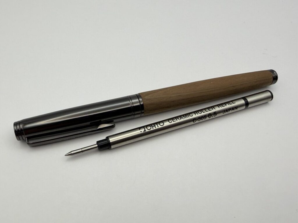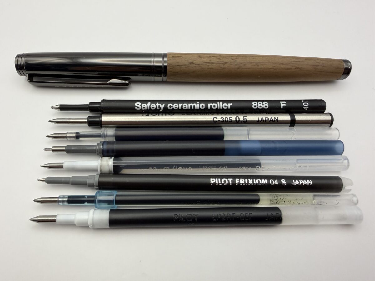 今回はハコアの木軸ローラーボール「BALLPOINT PEN SLEEK」とC300系リフィル+フリクションリフィル+ゲル「L」型リフィルとの互換性を検証してみました。