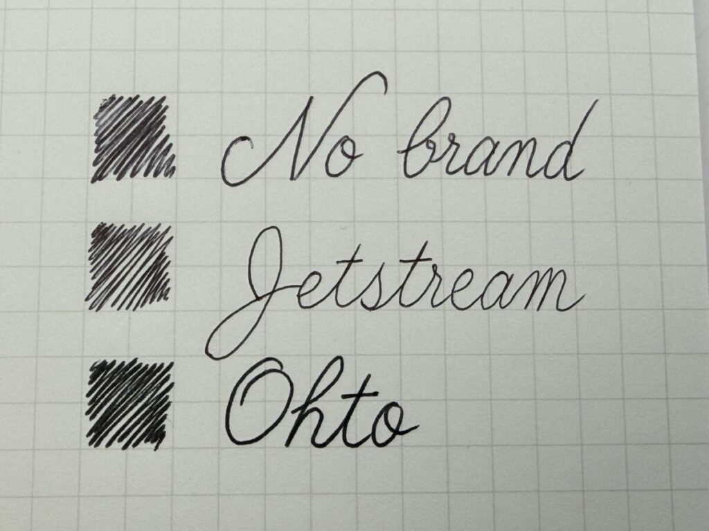 ノーブランドの油性インクらしいグレーな発色、ジェットストリームのシャープな黒、そしてOHTOの黒々としたゲルインクとそれぞれに特徴があって面白いですね。