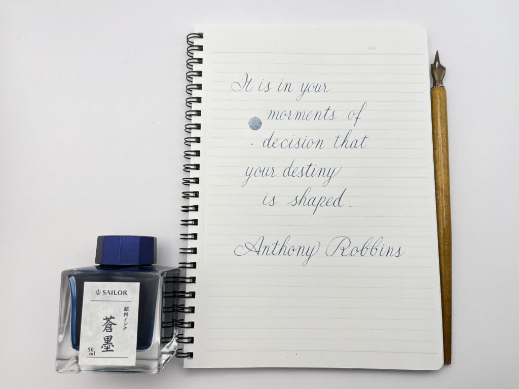 万年筆用のインクは紙によってはにじみやすいので、最初は粘度の高いカリグラフィー用のインクを使った方がいいのかなと思います。