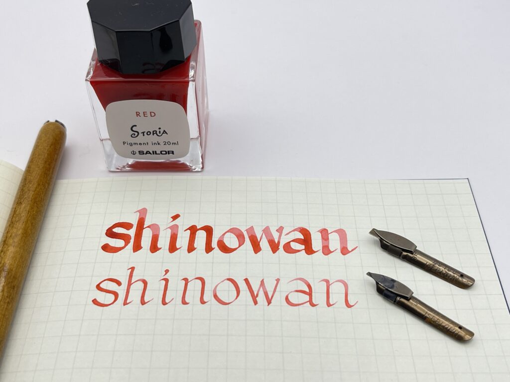 使用したインクはセーラー万年筆の顔料インク「ストーリア」のレッド、字体はファウンデーショナル体です。
