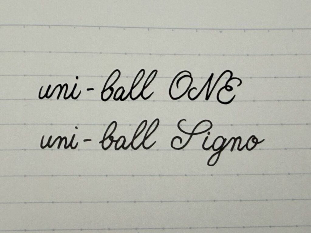 上がユニボールワンインク、下がシグノインク、ボールサイズはどちらも同じ0.5mmです。