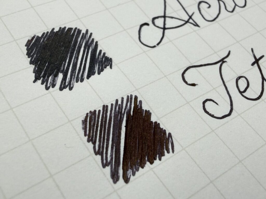 アクロインキは他社の低粘度油性インクと比較してもかなり黒く書けます。