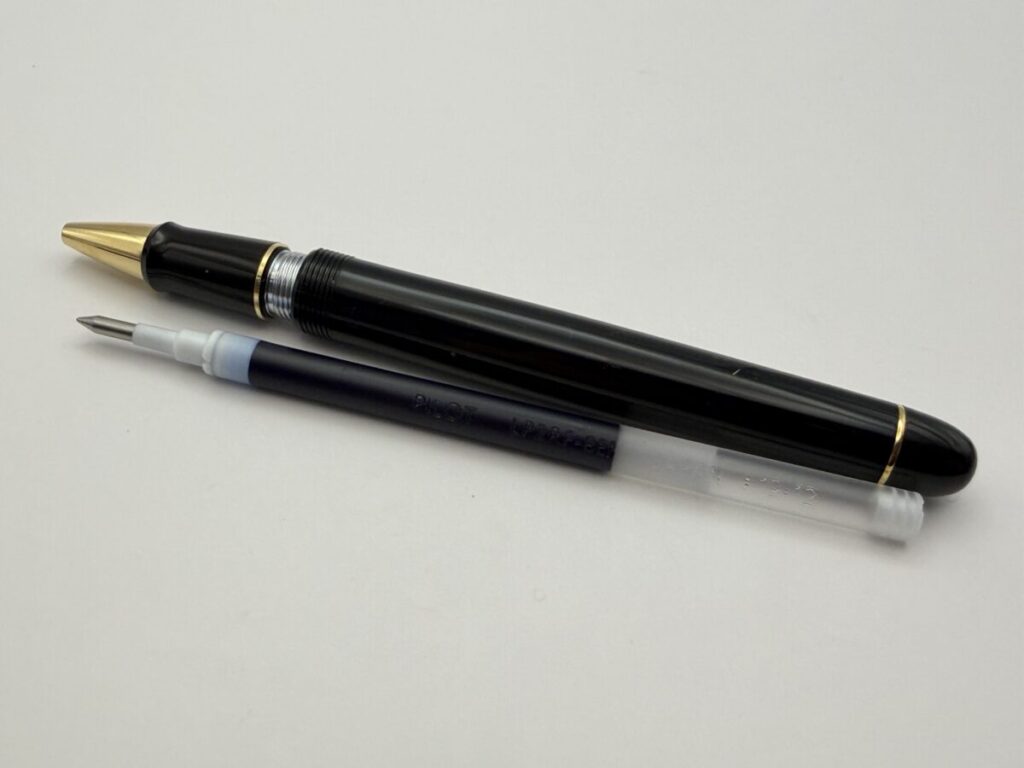 リフィルは軸内には収まり固定は問題なさそうですが、ペン先はやや飛び出てきている感じですね。