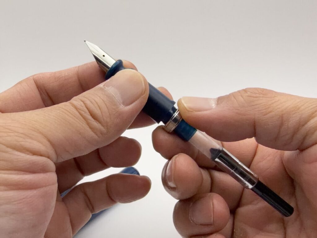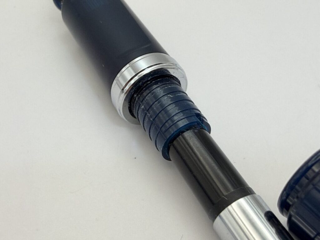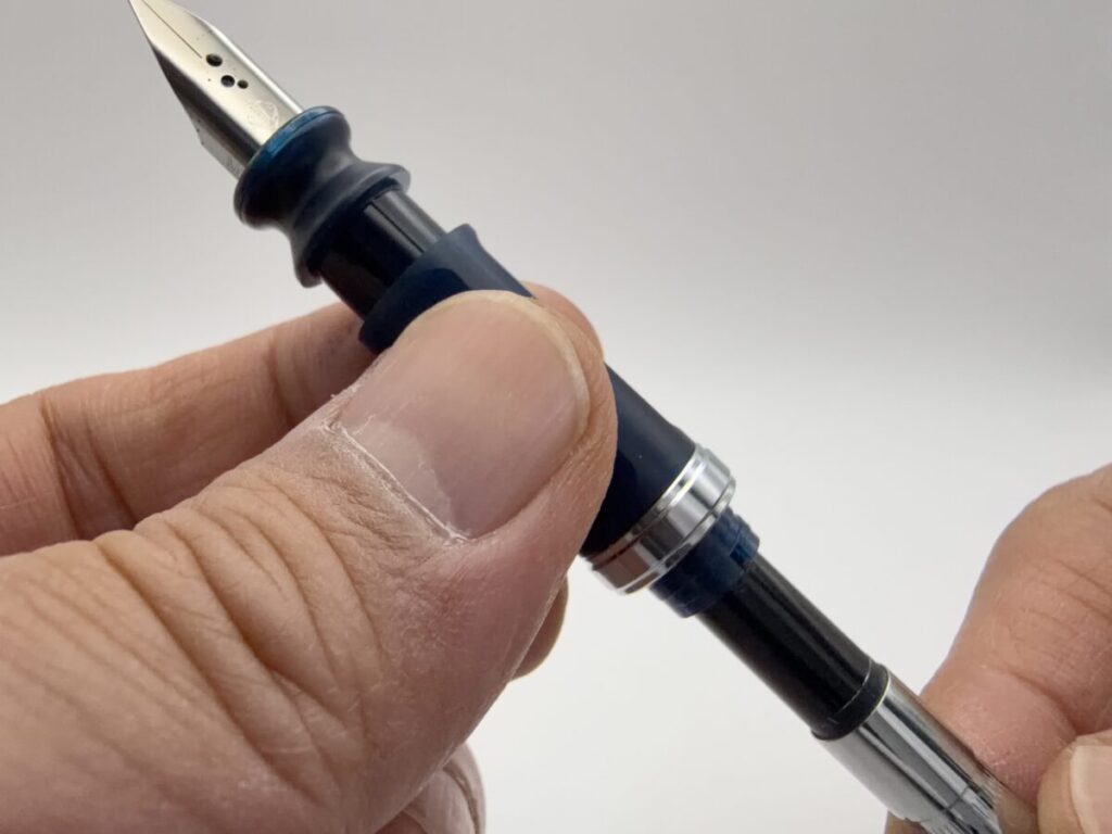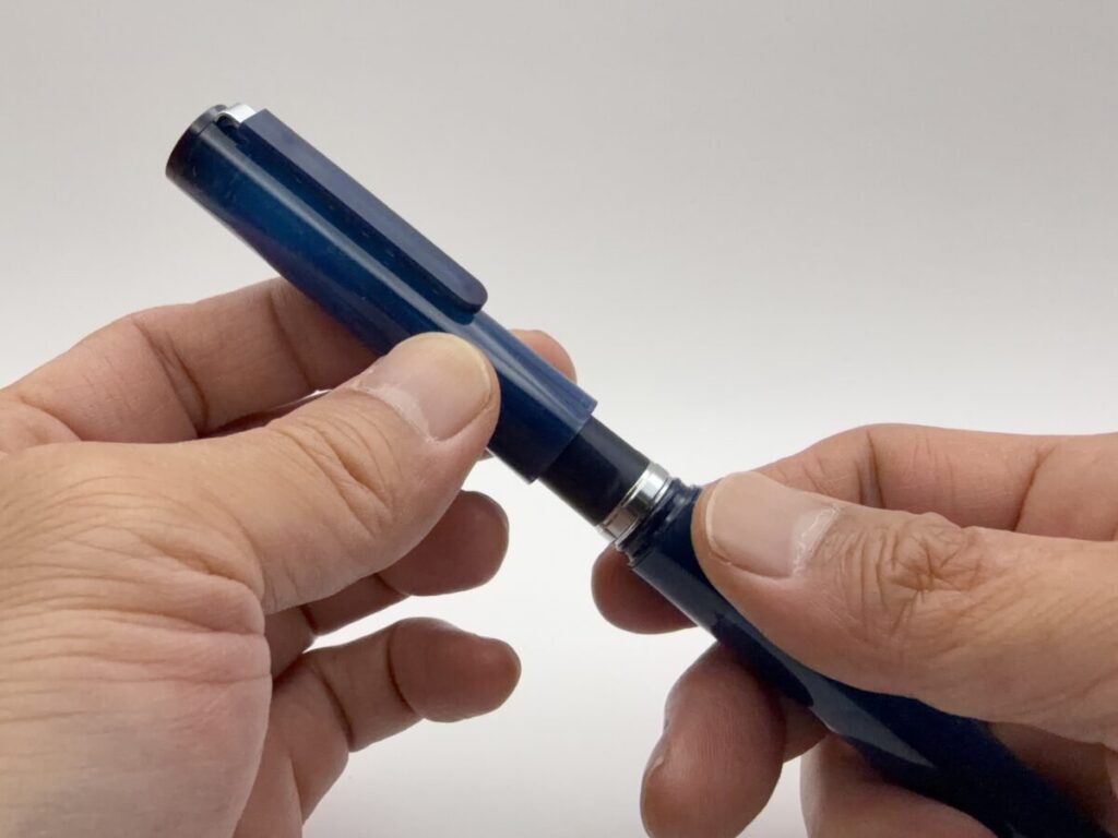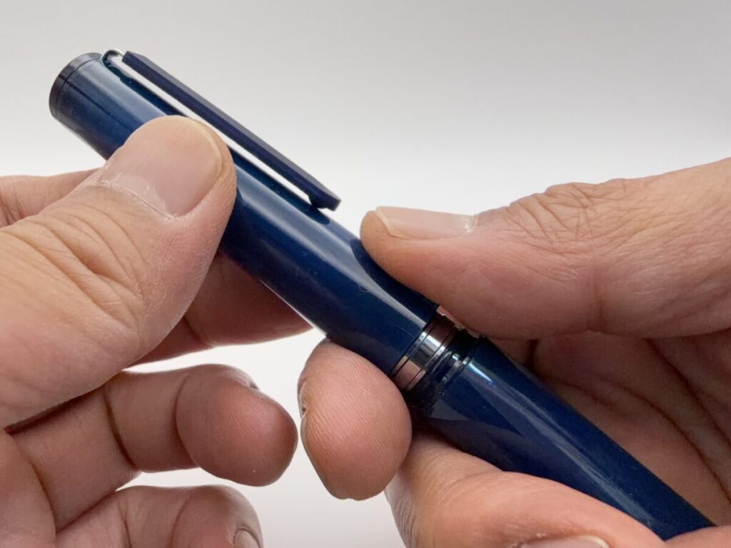 ペン先を上に向け、首軸部にあるメッキされたリングをネジを回す要領で下に降ろします。