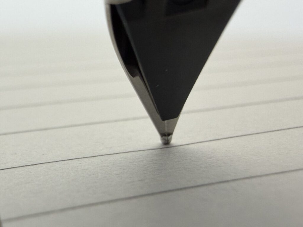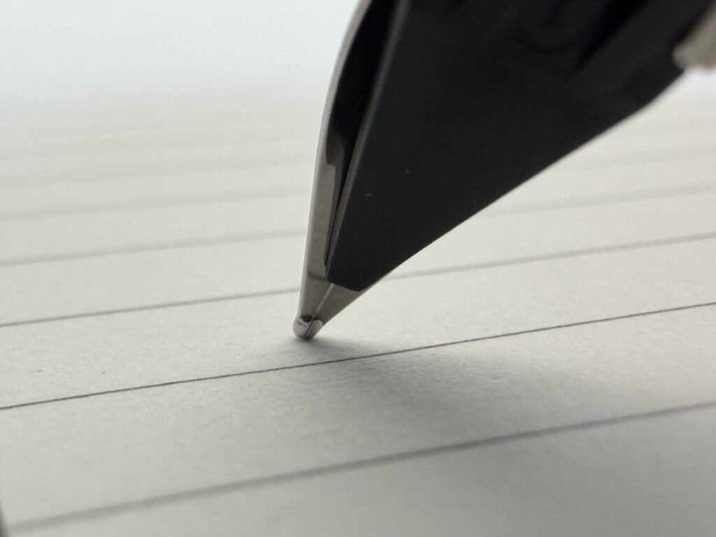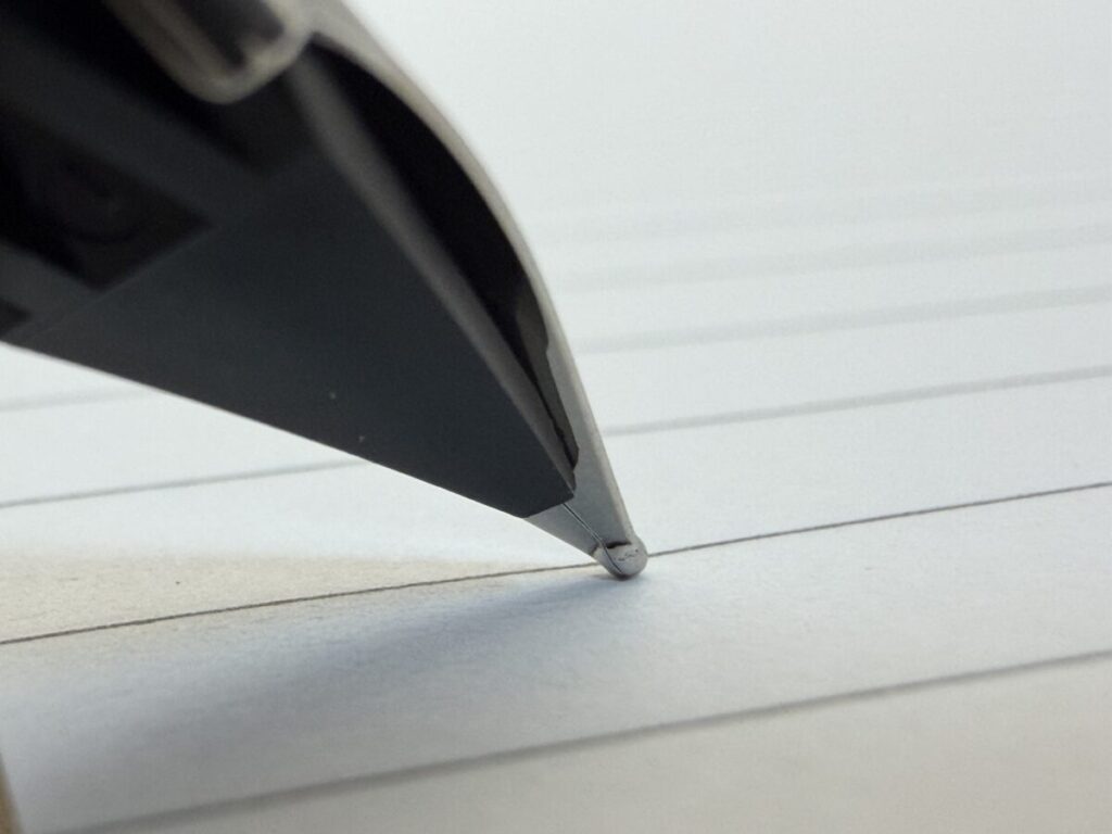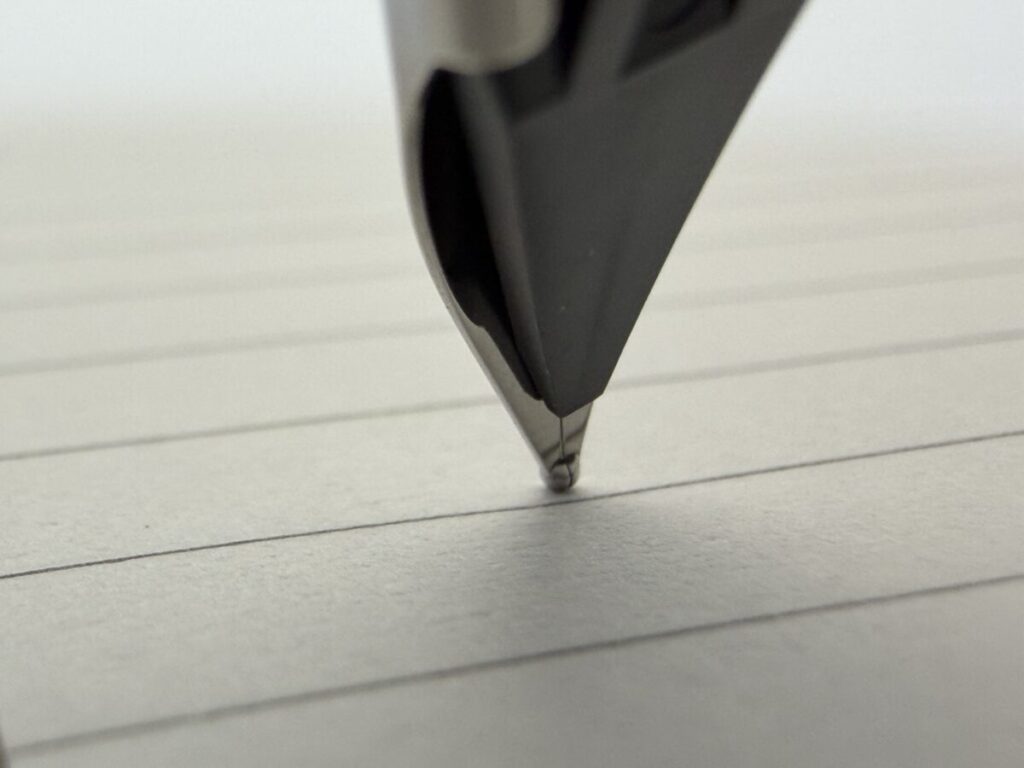 また切り割りが離れていることで、ペン先の角度を変えてもインクの供給ルートが歪みにくく安定した筆記感を得られるといった効果もあります。