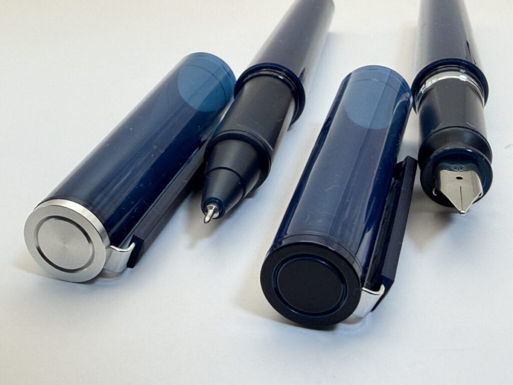 外見での違いが一か所だけあり、キャップの天冠が万年筆は軸と同じカラーの樹脂、ボールペンは銀色で(多分アルミニウム製)になっています。