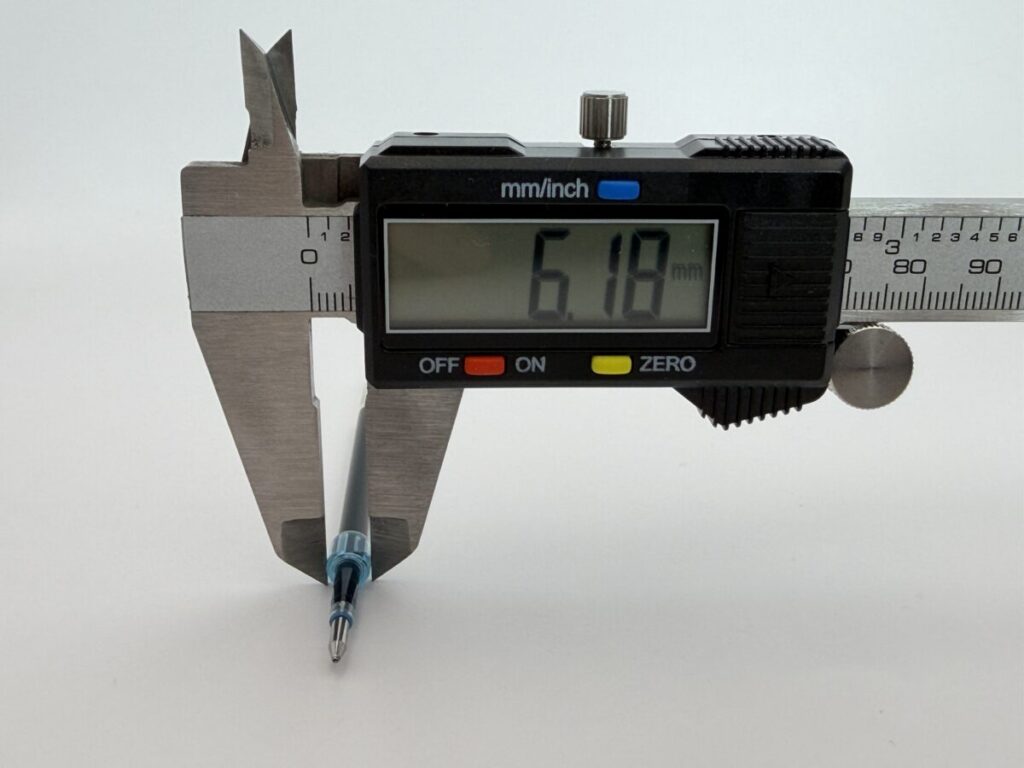 最大径(ペン先側の一番太い部分)が6.18mm、ペン先径が2.30mmでした。