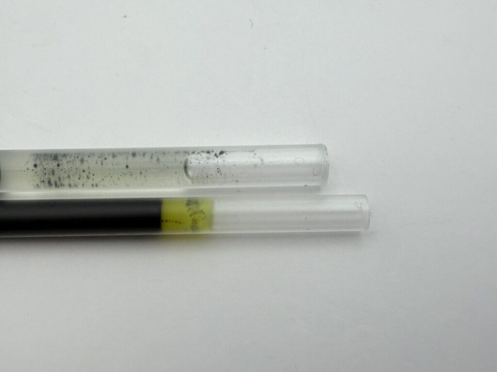今回は「ピュアモルト ジェットストリームインサイド」にアクロインキリフィルを使用する目的での検証なので、ジェットストリームリフィルのサイズと比べてみました。