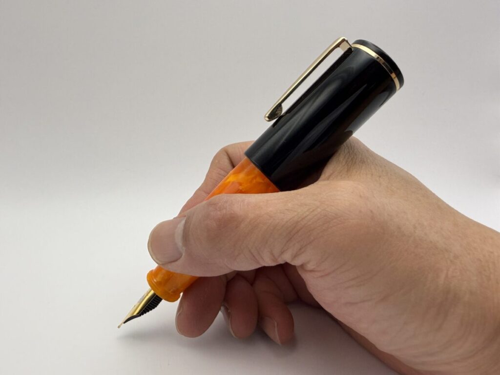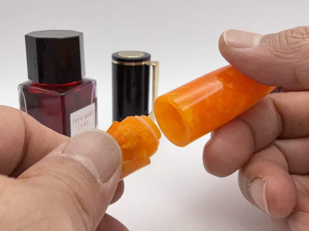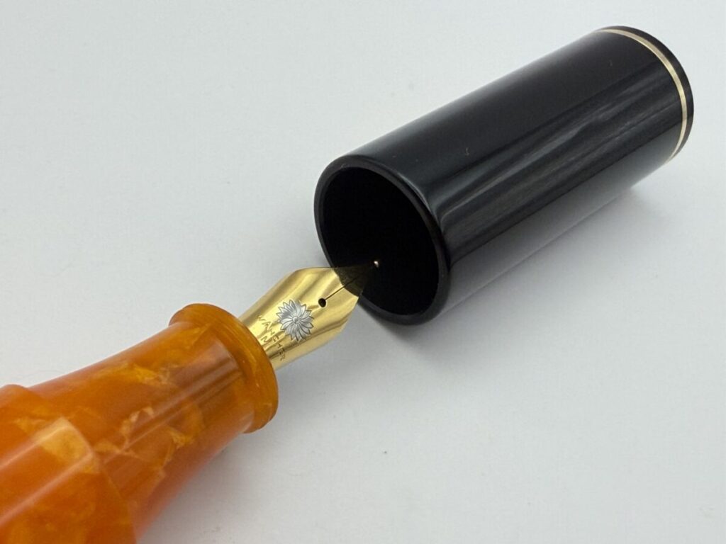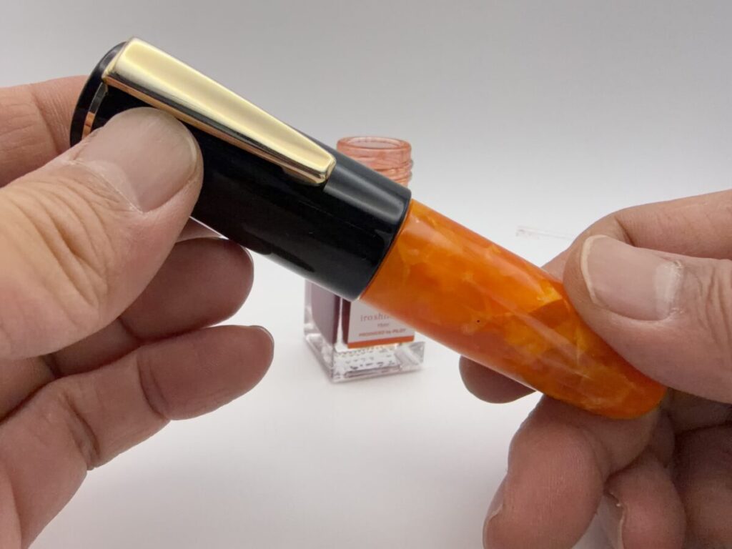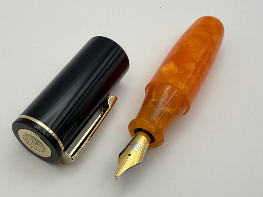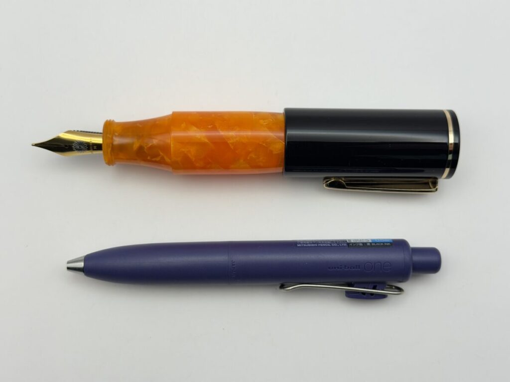 黒いキャップに、軸はマーブルオレンジカラーと、某高級筆記具のカラーリングを彷彿とさせるカラーリングで、ちょっとかっこいいなと思って選びました。